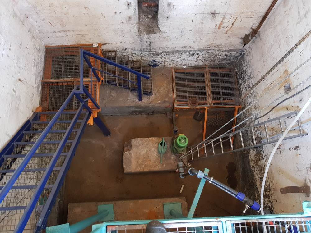 Hinter dem Wasserturm befand sich früher das Pumpenhaus, von wo aus der Turm mit Wasser befüllt wurde. Das Pumpenhaus besteht im Wesentlichen aus einem großen Schacht von fünf Metern Tiefe, auf dessen Boden früher große Förderpumpen installiert waren. Die Pumpen wurden in den 1990er Jahren entfernt und der Schacht zugeschüttet. Wir haben ihn nun wieder freigelegt, um ihn wieder seiner ursprünglichen Bestimmung zuzuführen.