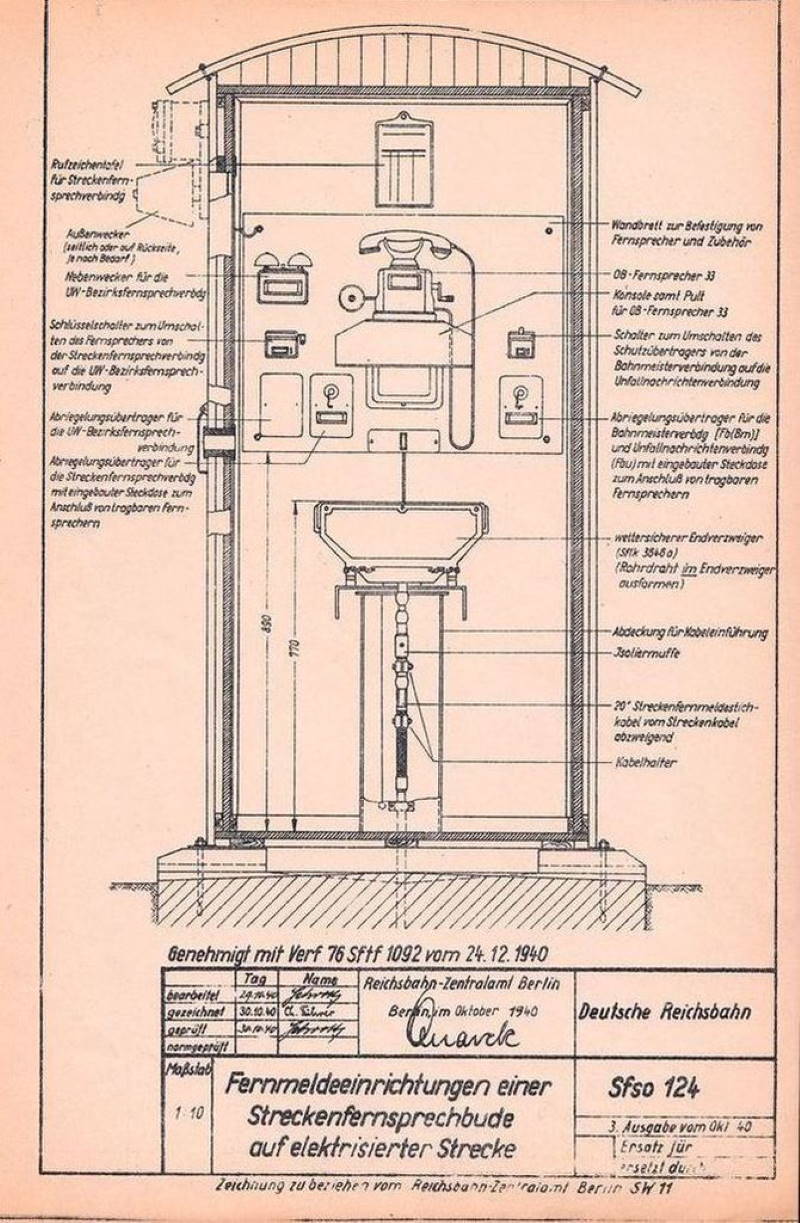 In regelmäßigen Abständen gab es Sprechstellen in solchen Buden, von denen man aus Telefonkontakt zur nächsten Betriebsstelle aufnehmen konnte (und teilweise heute noch kann). Die entsprechenden Telefone waren u.a. in solchen Fernsprechbuden untergebracht, die seit den 1930er Jahren in ihrem Design und in Bezug auf die Einrichtung genormt sind. Aus der entsprechenden Richtlinie vom 1.9.1933 ist die folgende Zeichnung entnommen, die das Innenleben zeigt:
