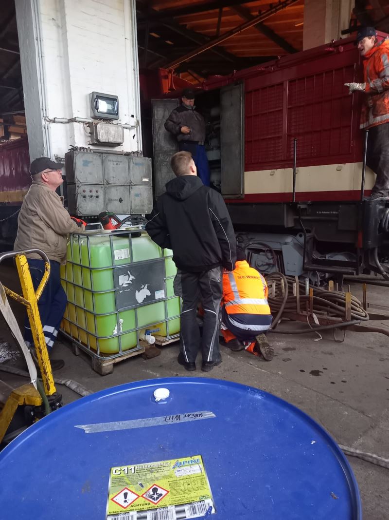 Auch modernere Fahrzeuge brauchen von Zeit zu Zeit Pflege. Auf dem nächsten Bild wird gerade die Kühlflüssigkeit der Diesellok 114 774 getauscht. Die neue hat ausreichend Frostschutzanteile. Sie wird in konzentrierter Form in Fässern angeliefert und muss noch mit Wasser gemischt werden. Dazu wird die Flüssigkeit zunächst von dem blauen Fass im Vordergrund in den eckigen Behälter gepumpt, hier mit Wasser verdünnt und anschließend in die Kühlanlage der Lok geleitet. Wahrscheinlich fragen Sie sich, wieviel Kühlflüssigkeit so ein Lokomotivmotor braucht: ca. 750 Liter.