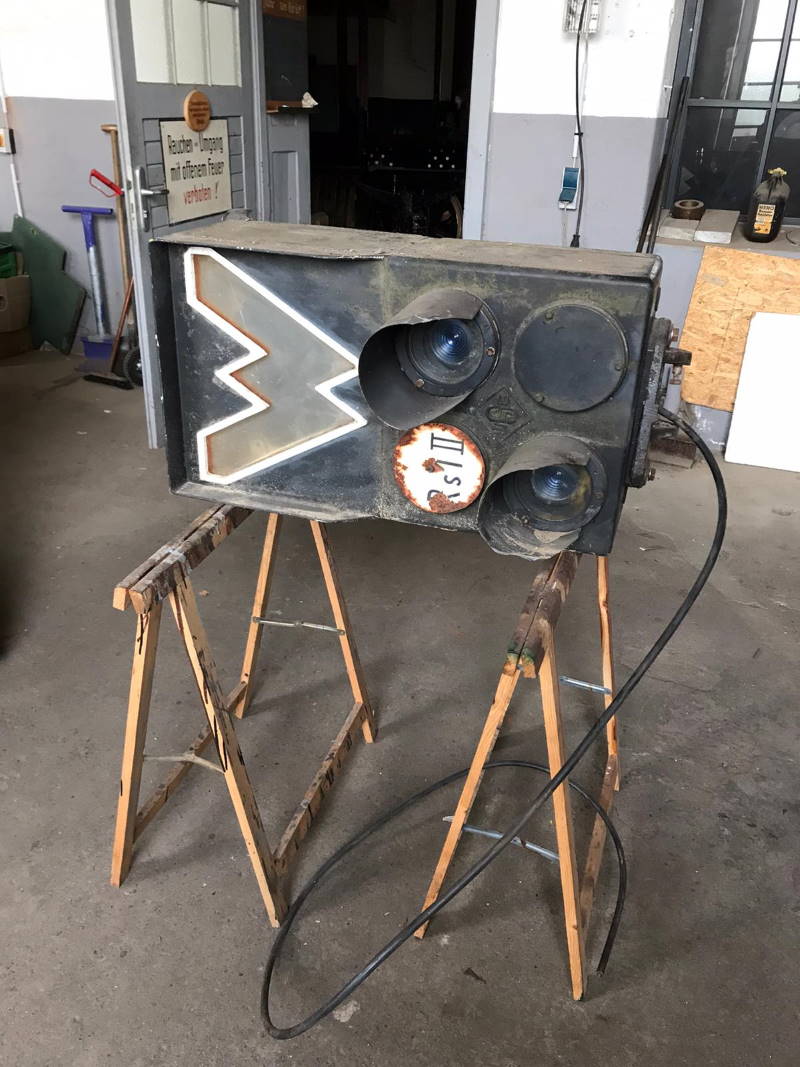 Unsere Elektriker haben sich inzwischen auch dem neuen Rangiersignal angenommen, das demnächst im unserem Gleisfeld in Betrieb genommen werden soll. Vorher müssen allerdings die Kabel, die Lampen und die Steuerung überprüft werden. Außerdem muss das „W“ wieder transparente orange Farbe erhalten. Das W bedeutet übrigens „Warten“. Erst wenn es aufleuchtet, darf eine Rangierfahrt an dem Signal vorbeifahren. Das Signal wird von unserem Stellwerk Wm bedient werden.