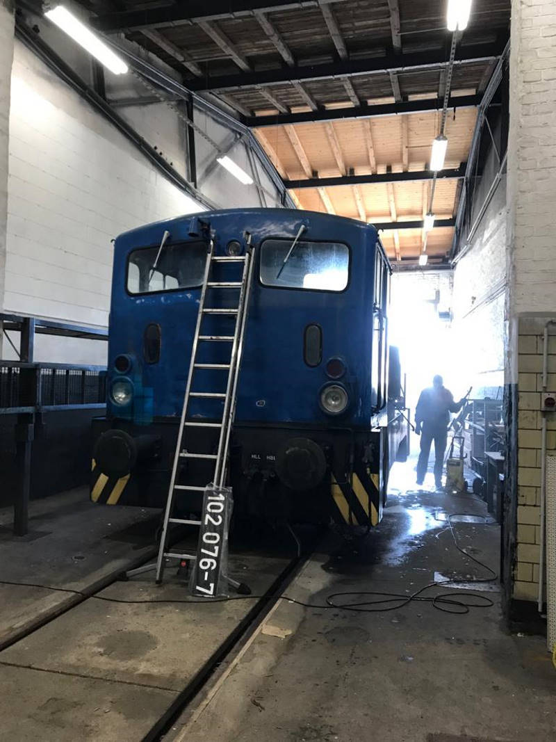 Eine der beiden betriebsfähigen Dieselloks der Baureihe V23 wurde in die Werkstatt gefahren, um sie gründlich zu reinigen. Die Lok trägt bisher die Betriebsnummer 2 des Zellstoffwerkes Stendal und eine blaue Farbgebung. Sie soll demnächst orange lackiert werden und die Betriebsnummer 102 076 tragen. Damit erinnern wir an den Einsatz einer baugleichen Lokomotive mit der Nummer beim Bahnbetriebswerk Wittenberge zu Zeiten der Deutschen Reichsbahn. Die Lok soll zukünftig zusammen mit dem demnächst wieder betriebsfähigen Beiwagen VB 197 805 eingesetzt werden. Diese Kombination solcher Beiwagen und Lokomotiven war früher typisch für die Nebenbahnen in der Prignitz und in der benachbarten Altmark.