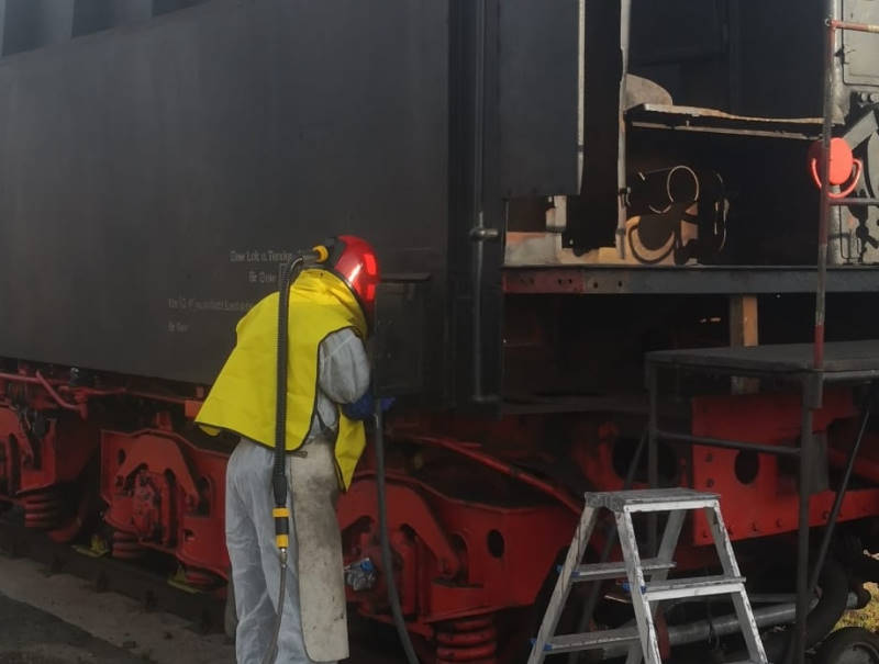 Nein, es sind keine Marsmännchen gelandet. Vielmehr wurde der Tender der Lok am Mittag in unser Außengelände gefahren, um ihn sandstrahlen zu können. Dabei werden die Metalloberflächen mit einem Granulat beschossen, das den Rost ablöst. Bei diesen Arbeiten muss man einen Schutzanzug tragen, weil die herumwirbelnden Körnchen zu Verletzungen führen können.
