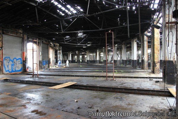 Darüber hinaus wurden die Rolltore, soweit derzeit möglich, geöffnet, um den Baumaschinen Platz zum Manövrieren zu schaffen. Im Schuppen wurde die alte Waschanlage nebst Heizrohren abgebaut und es wurde damit begonnen, das baufällige Dach sowie einen Anbau im Bereich des ehemaligen Schuppens I abzutragen.