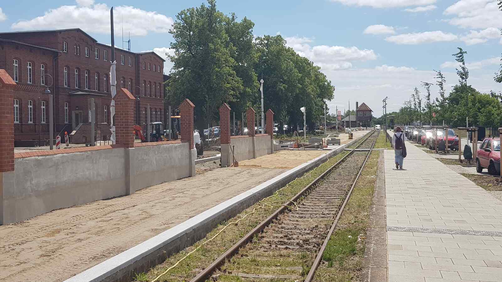 Im Zuge der Neugestaltung der Grünflächen und quasi schon als Vorbereitung auf die Landesgartenschau, die im Sommer 2027 in Wittenberge ausgerichtet wird, wurde der neben dem genannten Gleis gelegene Bahnsteig neu gestaltet. Er wird in Zukunft in die Grünfläche eingebunden, die entlang der Straße "Am Bahnhof" entsteht. Wir freuen uns sehr darüber, denn dadurch wird auch der Weg unserer Gäste vom Bahnhof angenehmer, wenn Sie ab Sommer 2026 mit der Bahn anreisen.